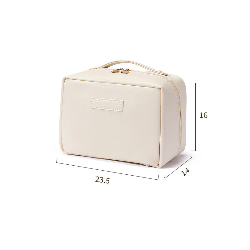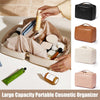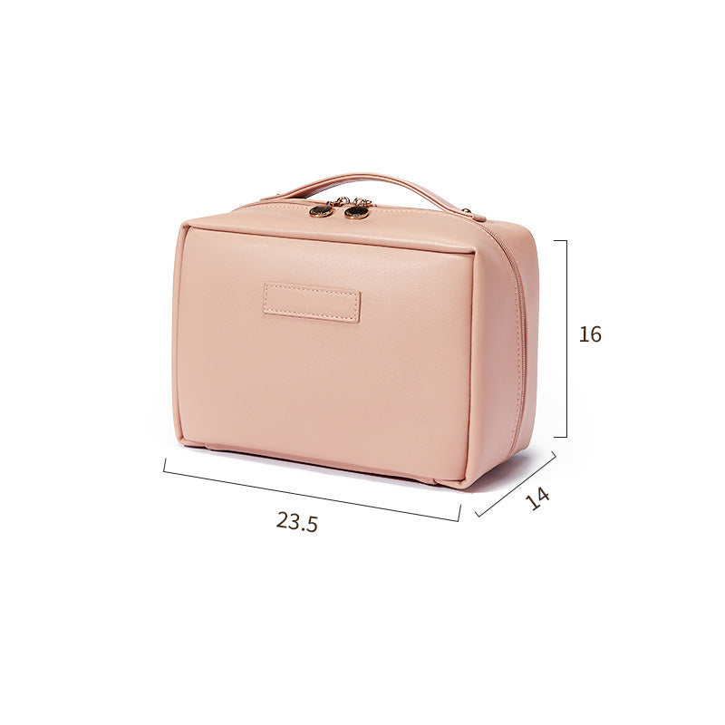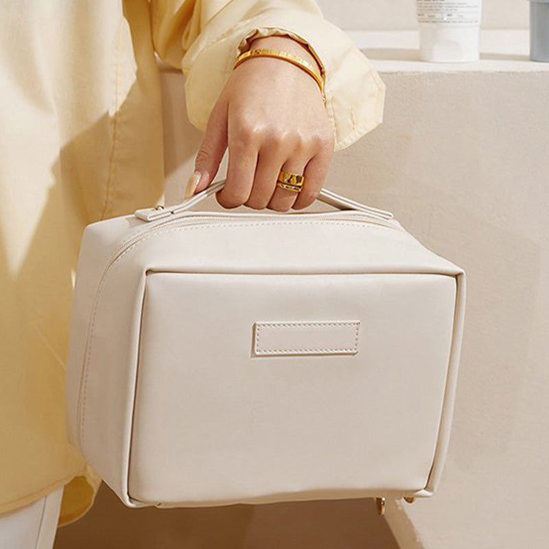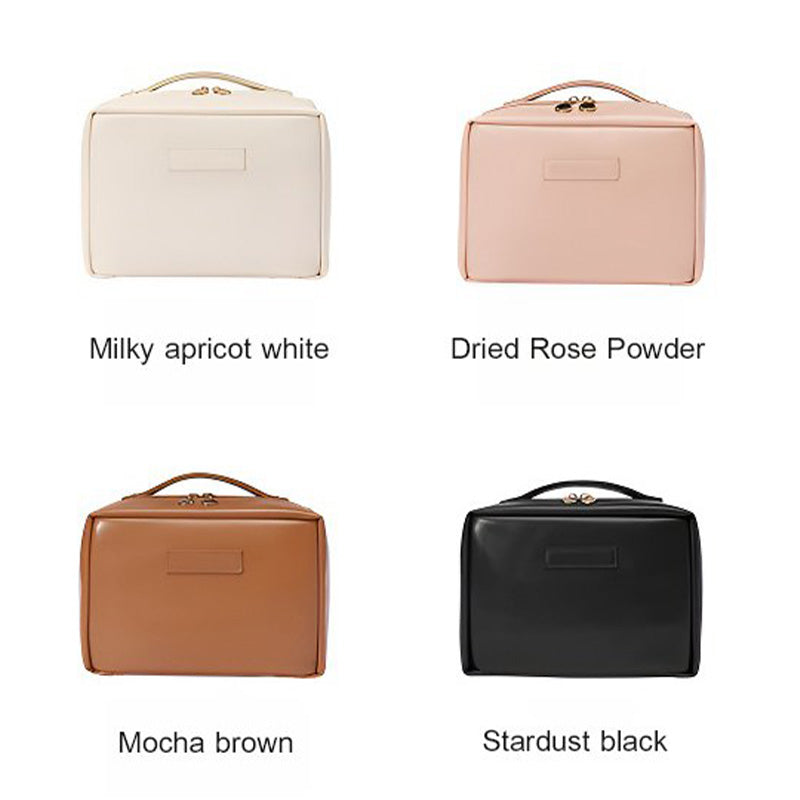 STIJLVOL EN DRAAGBAAR - De effen kleuropties van de tas voegen een vleugje elegantie en stijl toe aan haar schoonheidsroutine. Het is niet alleen functioneel, maar ook een modestatement. Het draagbare ontwerp heeft een handige draaggreep, waardoor het voor haar gemakkelijk is om haar beauty essentials overal mee naartoe te nemen.