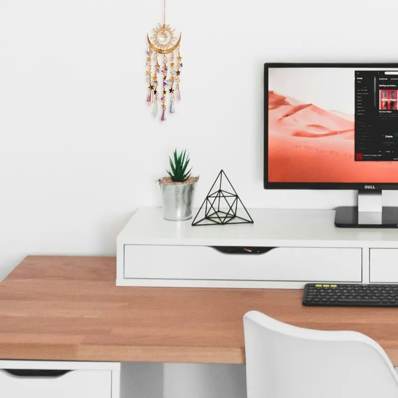 Regenboogmaker: De zonvanger heeft een glanzend metalen frame met zon-, maan- en sterrenpatronen. Kunstmatige kristallen en hangers vangen het zonlicht en creëren een dromerig licht- en schaduweffect. Het unieke ontwerp, de fijne afwerking en het sterke decoratieve karakter maken het een betoverend kunstwerk.