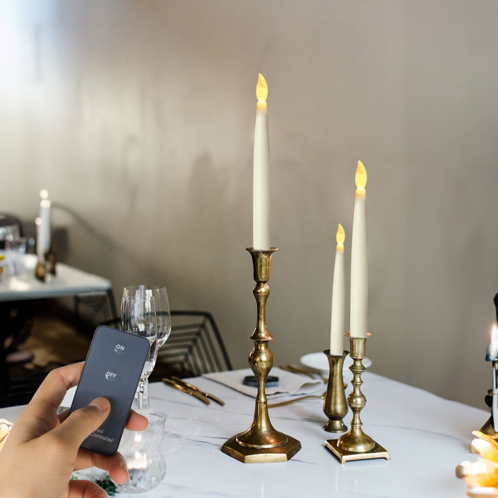Realistische flikkerende vlam: creëer een warme en gezellige sfeer met onze vlamloze taps toelopende kaarsen. Deze op batterijen werkende taps toelopende kaarsen zijn gemaakt van stevig plastic materiaal en hebben een 3D flikkerende vlam en druppelwasontwerp voor een realistische look en feel. Geniet van de comfortabele en veilige ambiance van vlamloze kaarsen.