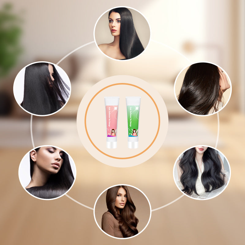 GEBRUIKSAANWIJZING - Breng Cream A gelijkmatig aan op droog haar. Kam je haar recht en wacht 15 minuten. Uitspoelen en handdoekdroog maken. Breng crème B aan en wacht nog eens 15 minuten. Spoel ten slotte grondig uit en föhn je haar in de richting van je pony.