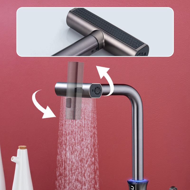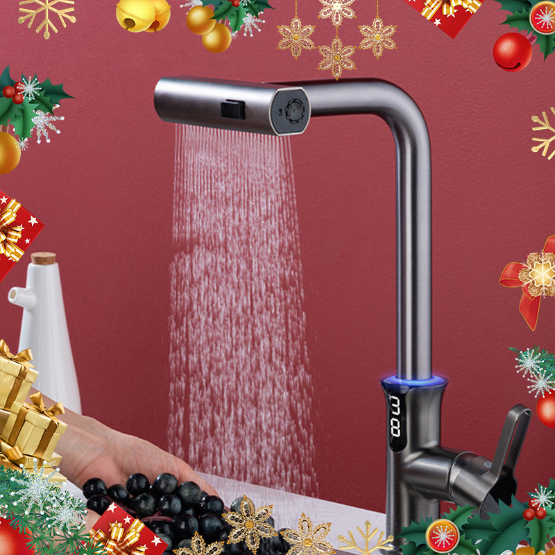 Deze Multifunctionele Uittrekbare Keukenkraan Met Digitaal Temperatuurdisplay biedt 3 waterstanden voor veelzijdig gebruik en een digitaal temperatuurdisplay voor de veiligheid. Hij heeft een 360 graden draaibaar en hefbaar ontwerp met een uittrekbare sproeier voor eenvoudige bediening. De lange enkele handgreep zorgt voor precieze controle over watertoevoer en temperatuur. Het moderne stijlvolle uiterlijk voegt verfijning en kwaliteit toe aan je badkamer.
