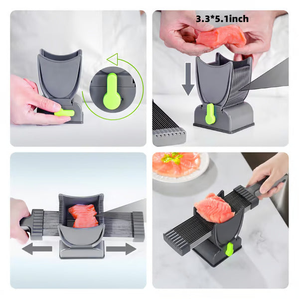ÉÉN KEER 18 PLAKJES: Themeat snijderset is het ultieme gereedschap voor precisiesnedes met 17 messen, snijdt eenvoudig vers vlees in 18 dunne plakjes in één beweging, compatibel met een verscheidenheid aan vers vlees, waaronder varkensvlees, rundvlees, kipfilet en zalm.