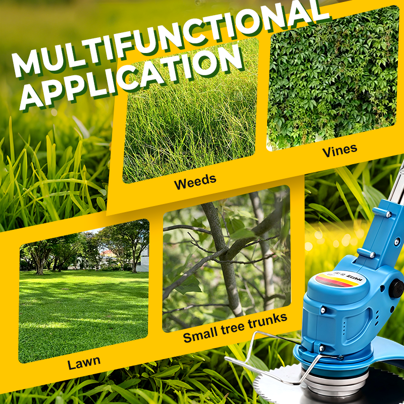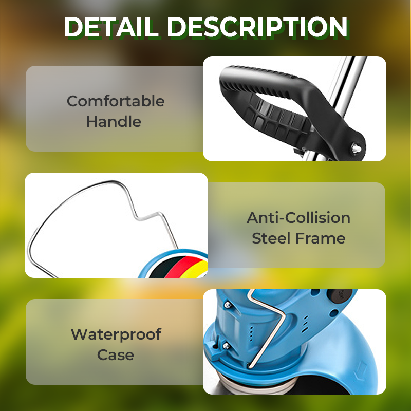 DUBBELE VEILIGHEIDSSCHAKELAAR – Dankzij de dubbele bedieningsschakelaar is dit gereedschap veilig te gebruiken en onbedoeld starten te voorkomen. Het stalen frame met antibotsing voorkomt dat de messen harde voorwerpen zoals stenen raken.