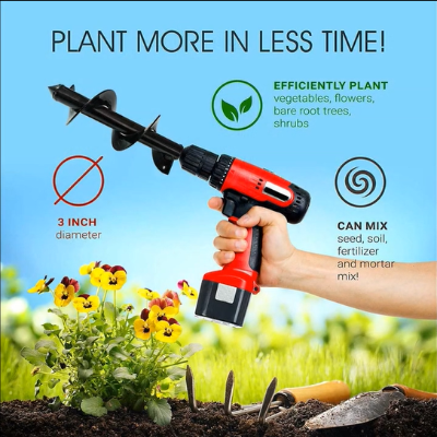 Energiebesparend: Gebruik elke elektrische of snoerloze boor waarin een 10 mm (3/8") bit past. Het graaft niet alleen diepe gaten, het verpulvert ook meteen de grond, zodat u in minder tijd meer kunt planten.